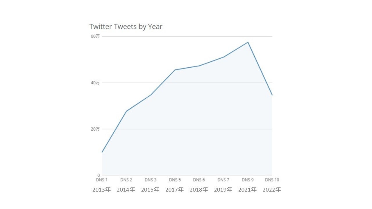 世界がよりデジタル化していることは間違いありませんが、どのようなプラットフォームにも浮き沈みがあります。Twitterの投稿数は、DNS1版が始まった2013年以降3倍近く増加していますが、2021年に比べてユーザーの投稿数は40%減少しています。2021年のDNS 9版では1分間に57万5,000件の投稿がありましたが、2022年では34万7,000件余りとなっています。