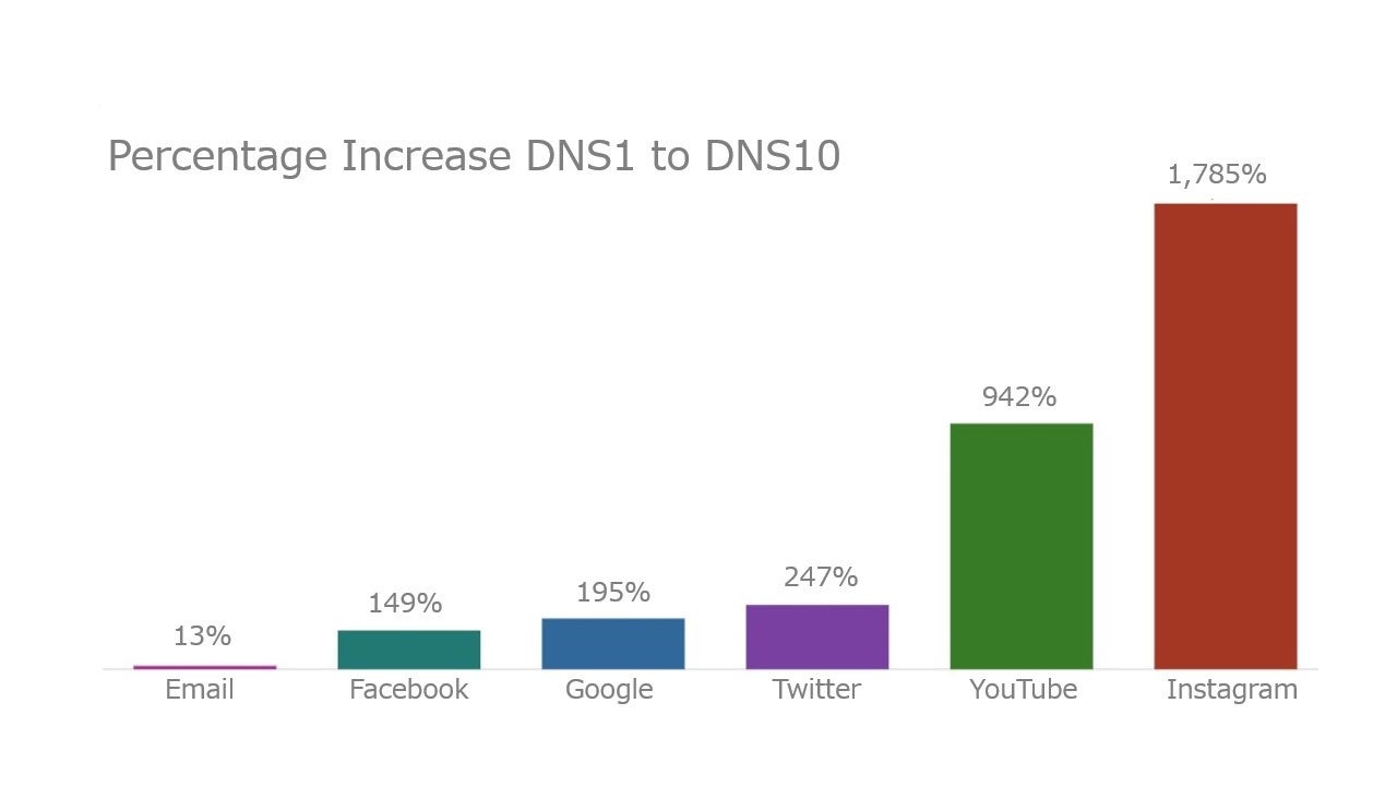 下記はチャネル別(YouTube、Instagram、Twitter、Facebookの投稿、Google検索、Email送信)データ利用情報を2013年のDNS第1版と2022年の第10版で比較したチャートです。全体的に、この10年でデジタル接続の頻度は上昇していますが、利用頻度が微増にとどまるチャネルもあれば、急上昇しているものもあります。