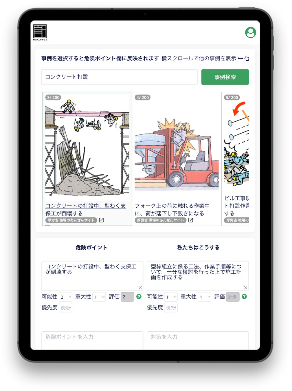 スマートフォン・タブレット・PCでKY(危険予知)活動ができるアプリです。入力した作業名をもとに、AIが労働災害事例・危険ポイントを検索・提案することで、属人的でないKYを実現し、労働災害リスクの低減に貢献します。