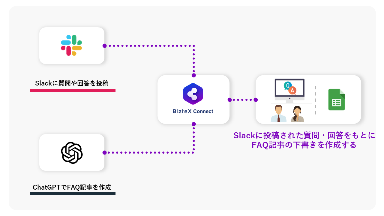 今回リリースしたAPI連携コネクタにより、SaaSとOpenAI(ChatGPT)を組み合わせ、業務を自動化することが可能になります。通常、ChatGPTのAPIを利用するにはプログラミングのスキルが必要ですが、BizteX Connectを利用することで、エンジニア以外の方でも簡単に業務を効率化できるようになります。競合他社のリサーチやCRM施策、FAQの作成など、様々な用途でご活用いただけます。