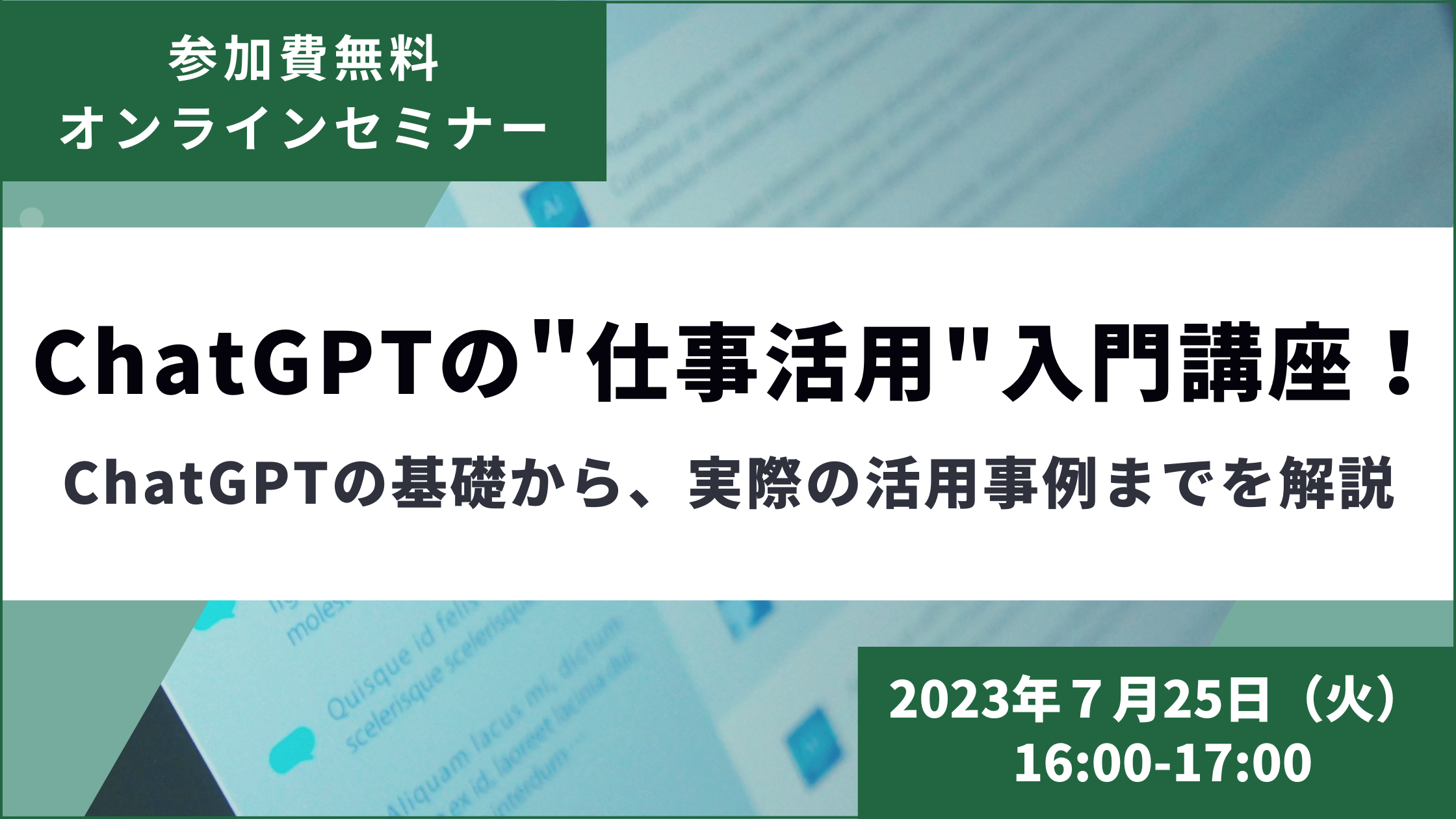 ・タイトル:「ChatGPTの"仕事活用"入門講座!ChatGPTの基礎から、実際の活用事例までを解説」