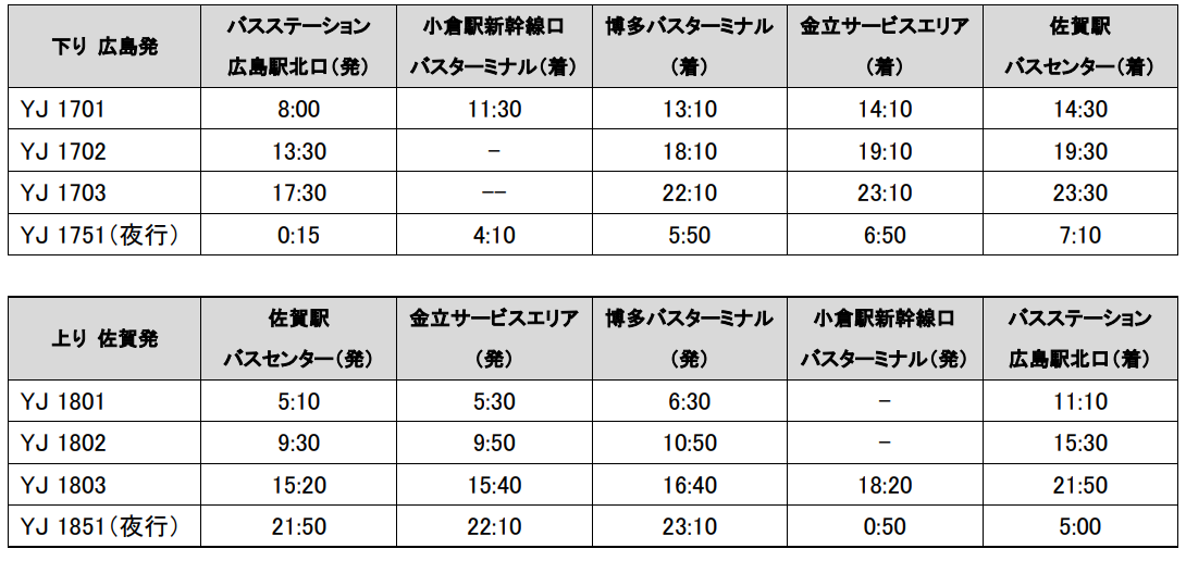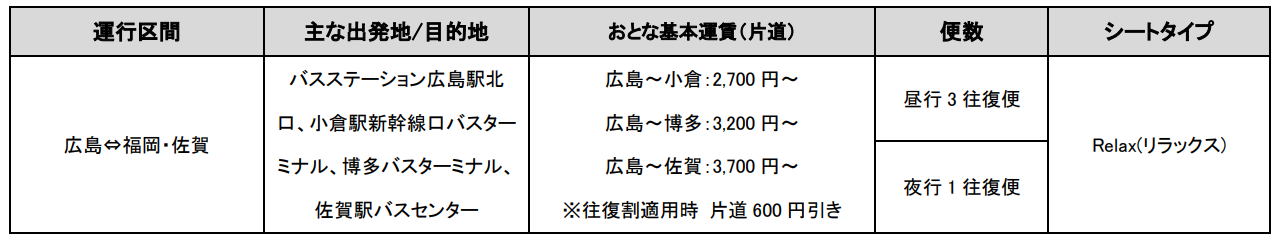 広島から小倉・博多・佐賀間を、昼行3往復・夜行1往復運行します。