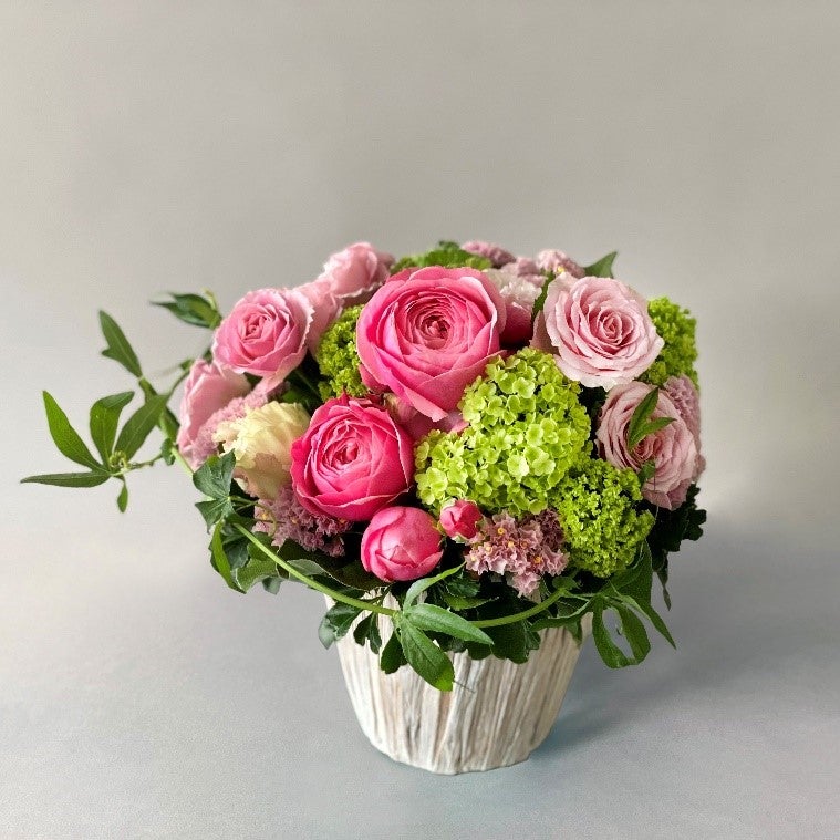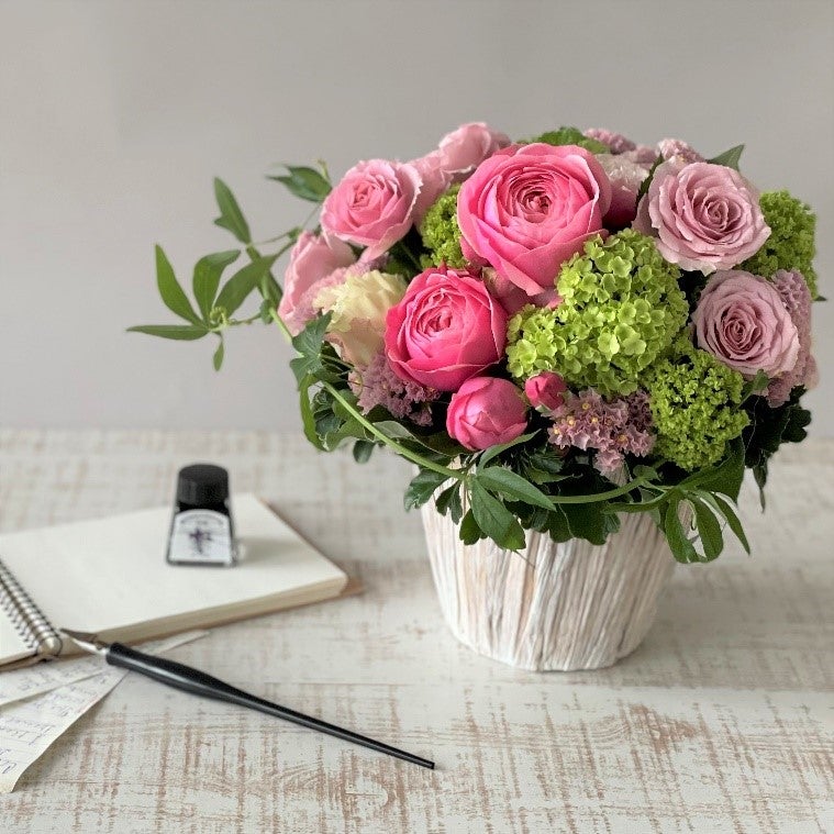 器つきのアレンジメントは、そのまま飾れる便利なアイテム。花瓶を用意する必要がないのでギフトにもおすすめです。