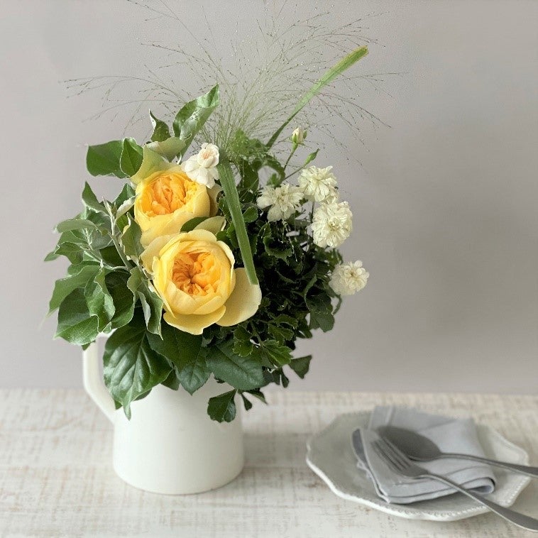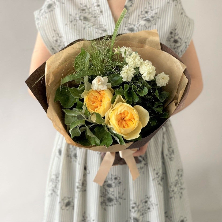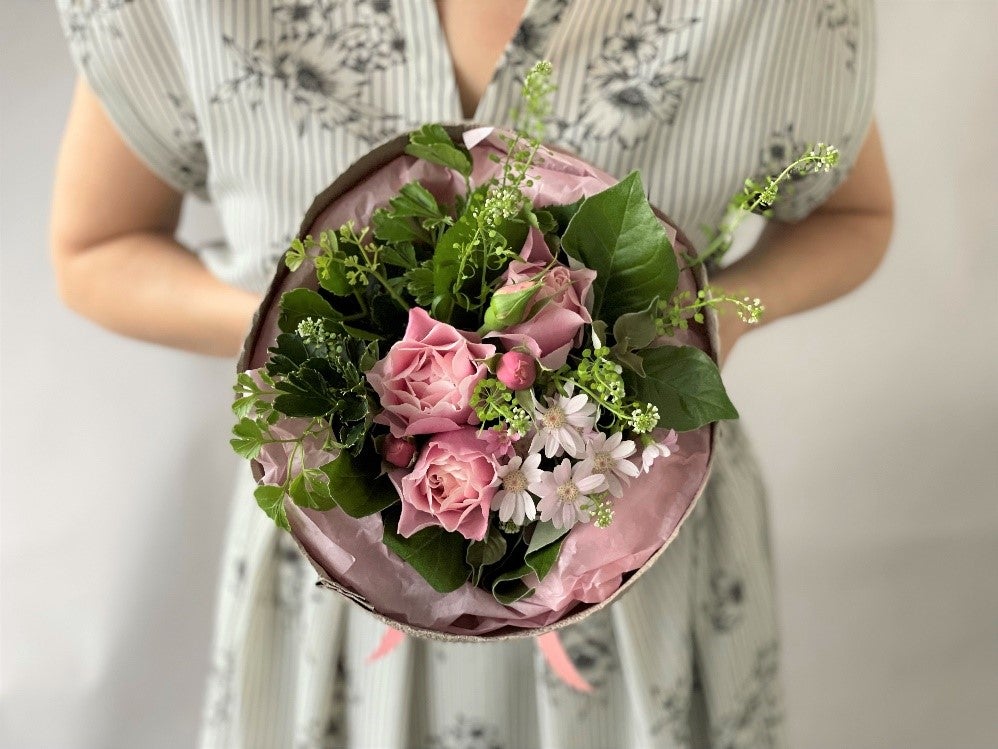 バラと季節の小花を束ねたブーケはリビングや食卓にもぴったりです。