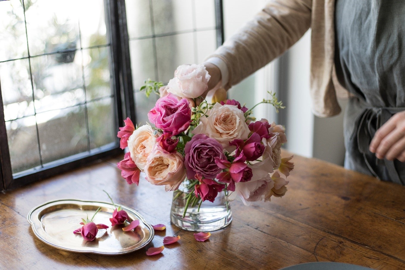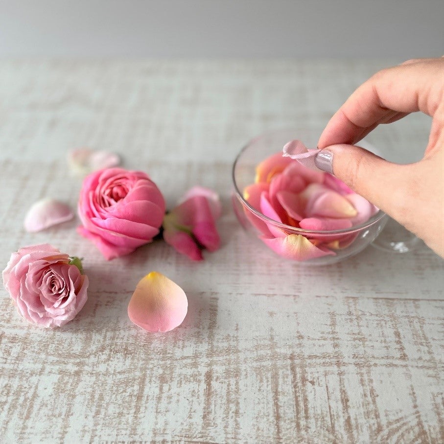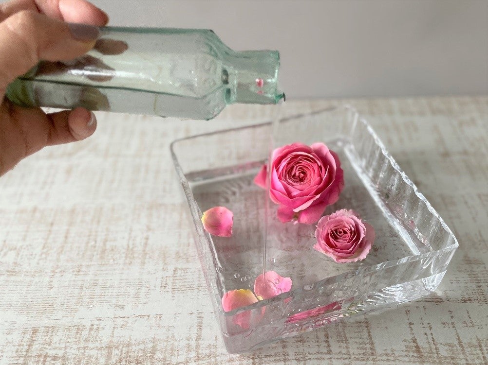 薄く水を張ったお皿に花や花びらを浮かべるだけで素敵なアレンジメントができあがります。ぜひ、バラを最後までお楽しみください。