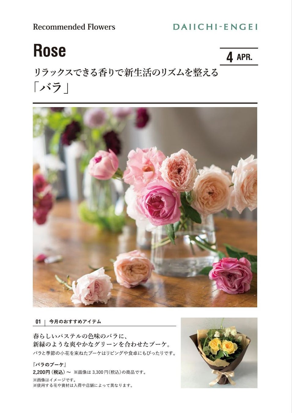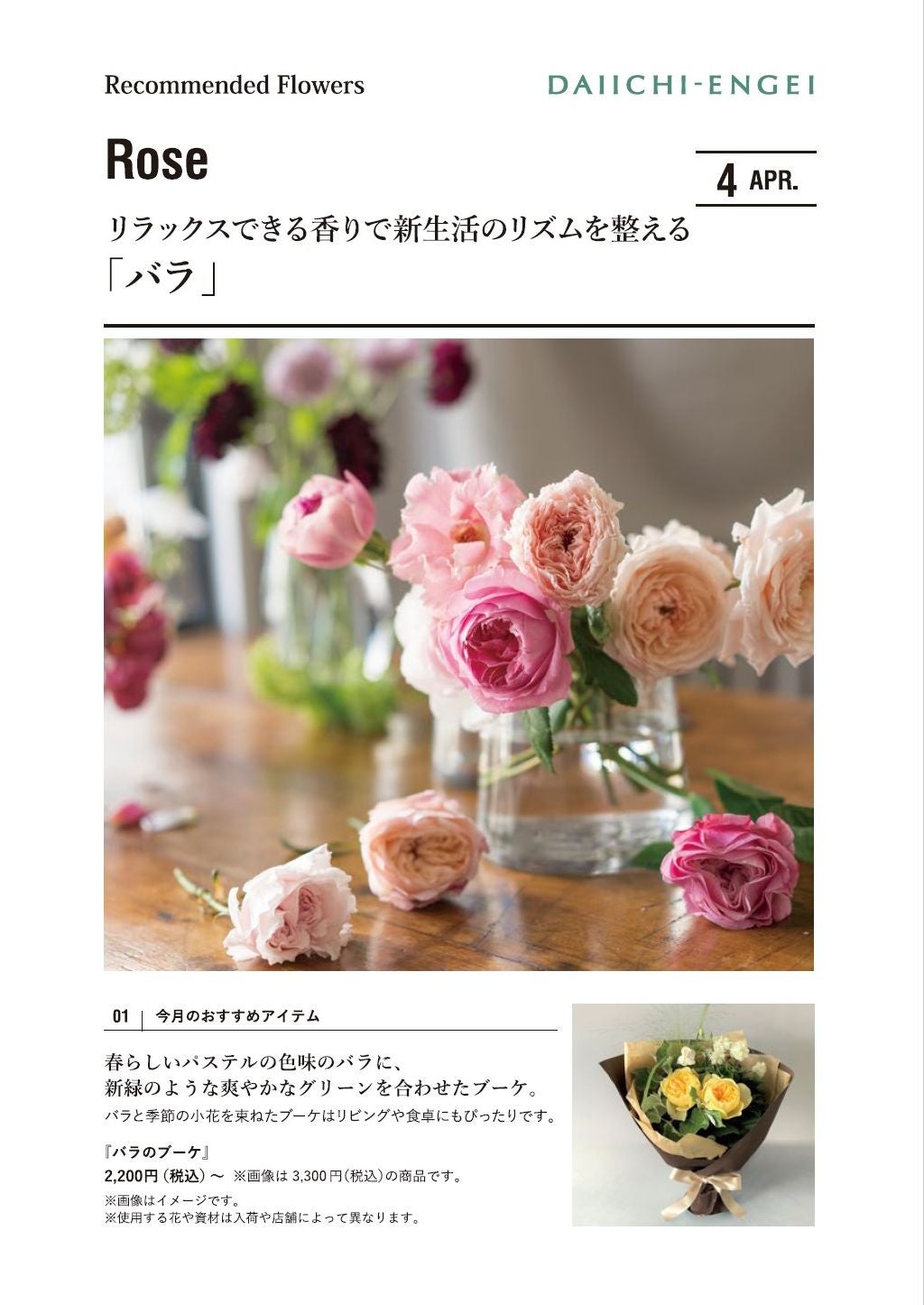 花と緑に関する事業を展開する第一園芸株式会社(本社:東京都品川区、代表取締役社長:伊藤昇、三井不動産グループ)は、4月のおすすめの花である「バラ」のフェアを、4月1日(金)から第一園芸の全店舗で展開します。