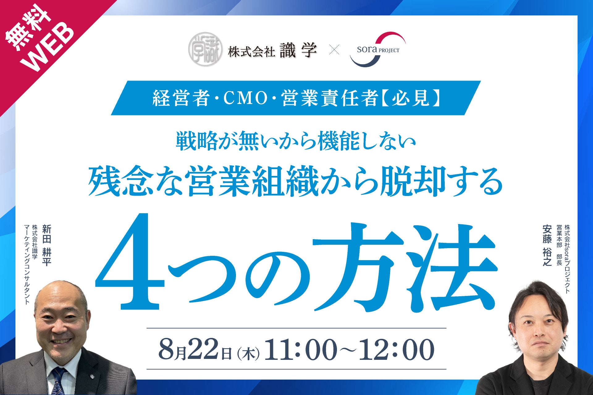 組織コンサルティング事業を展開する株式会社識学(本社:東京都品川区、代表取締役社長:安藤 広大)と、BtoB向けインサイドセールス代行・WEBマーケティング支援を行う株式会社soraプロジェクト(本社:福岡県筑紫野市、代表取締役社長:樋口 裕貴)は、共催ウェビナー「戦略が無いから機能しない残念な営業組織から脱却する4つの方法」を、2024年8月22日(木)11時より開催いたします。