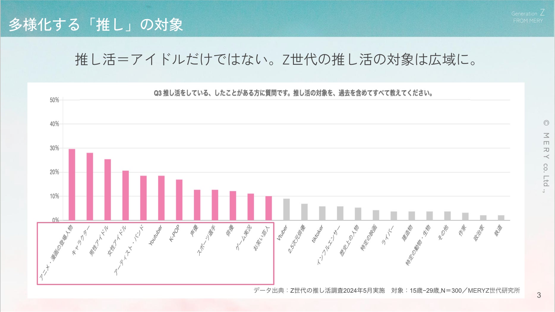 株式会社MERY(本社:東京都千代田区 代表取締役社長:藤田 欣司)が運営する『MERY』(https://mery.jp/)では、Z世代の意識や行動について研究するために、定期的な「Z世代調査」を実施しています。今回、2024年5月に実施した『推し活に関するMERYアンケート』について、調査結果をご報告致します。