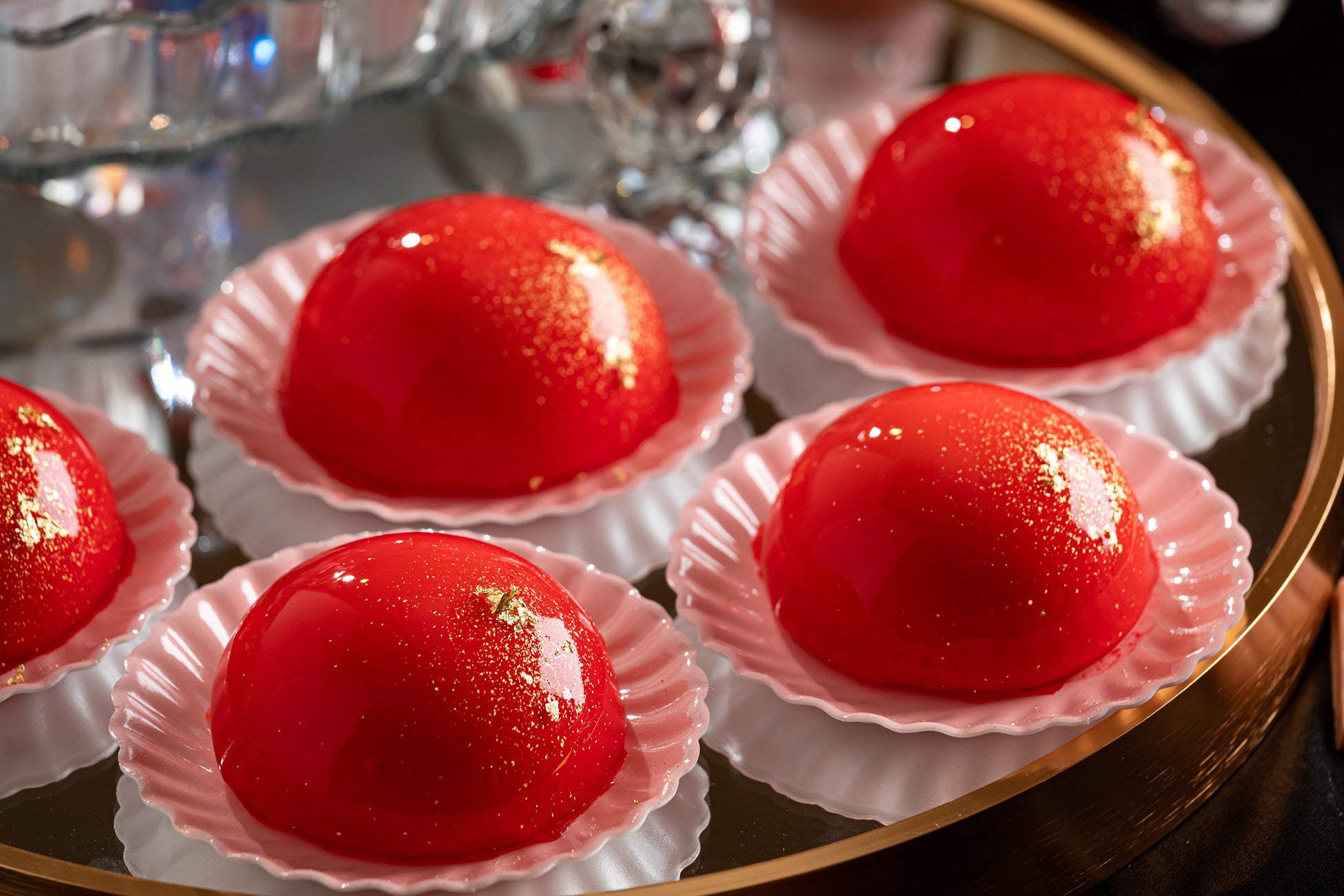 艶やかなルビー色のグラサージュに金箔を添えた「ルビードームストロベリー」は、なめらかなストロベリームースの中に、やさしい甘さの練乳クリームを閉じ込めた気品あふれる仕上がりに。