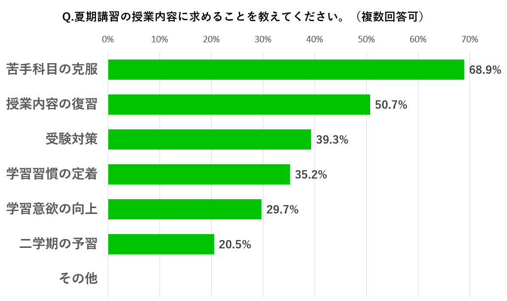 夏期講習を受講させない理由として、「塾に通っていないから」「費用が高いから」「子どもが望んでいないから」が僅差で上位3つに挙げられました。特に元々塾に通わせていないご家庭にとっては、夏期講習はハードルの高いもののようです。「その他」の回答では、「部活が忙しいから」という理由が多く挙げられました。