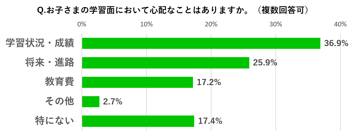 また、学習面において心配なことで最も票が多かったことが「学習状況・成績」でした。夏期講習を受講しないご家庭でも、多くの方がお子さまの学習状況や成績を気にしていることが伺えました。