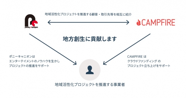 ポニーキャニオン社とCAMPFIRE社が、地方創生の分野で業務提携をした。連携テーマは「地方創生」分野で、ポニーキャニオンが有するエンターテインメントを通じた地方創生のノウハウとCAMPFIREが有するクラウドファンディングのプロジェクトのノウハウを活かし、現在日本全国で数多く立ち上がっている地域活性化プロジェクトを加速化していく。