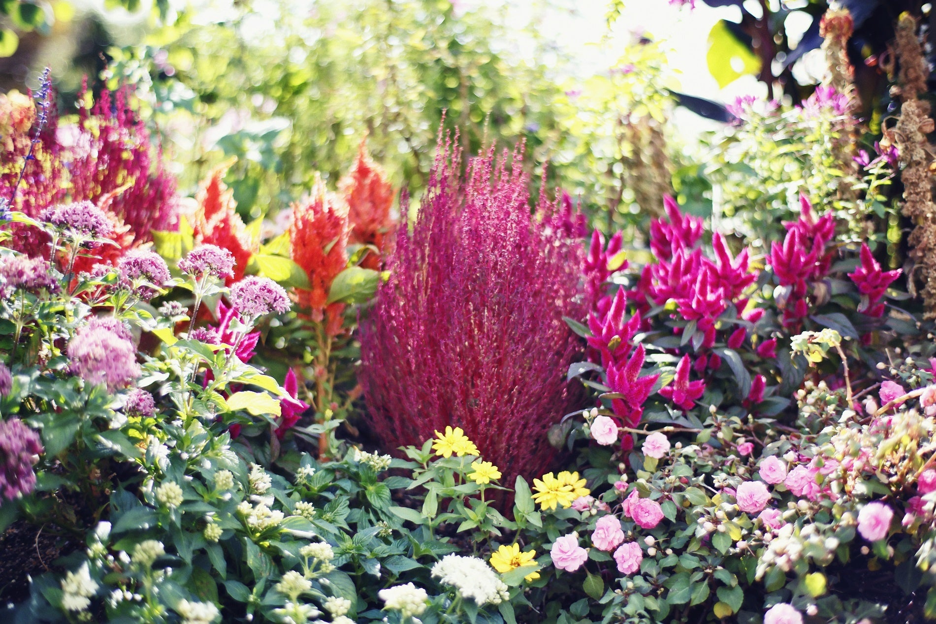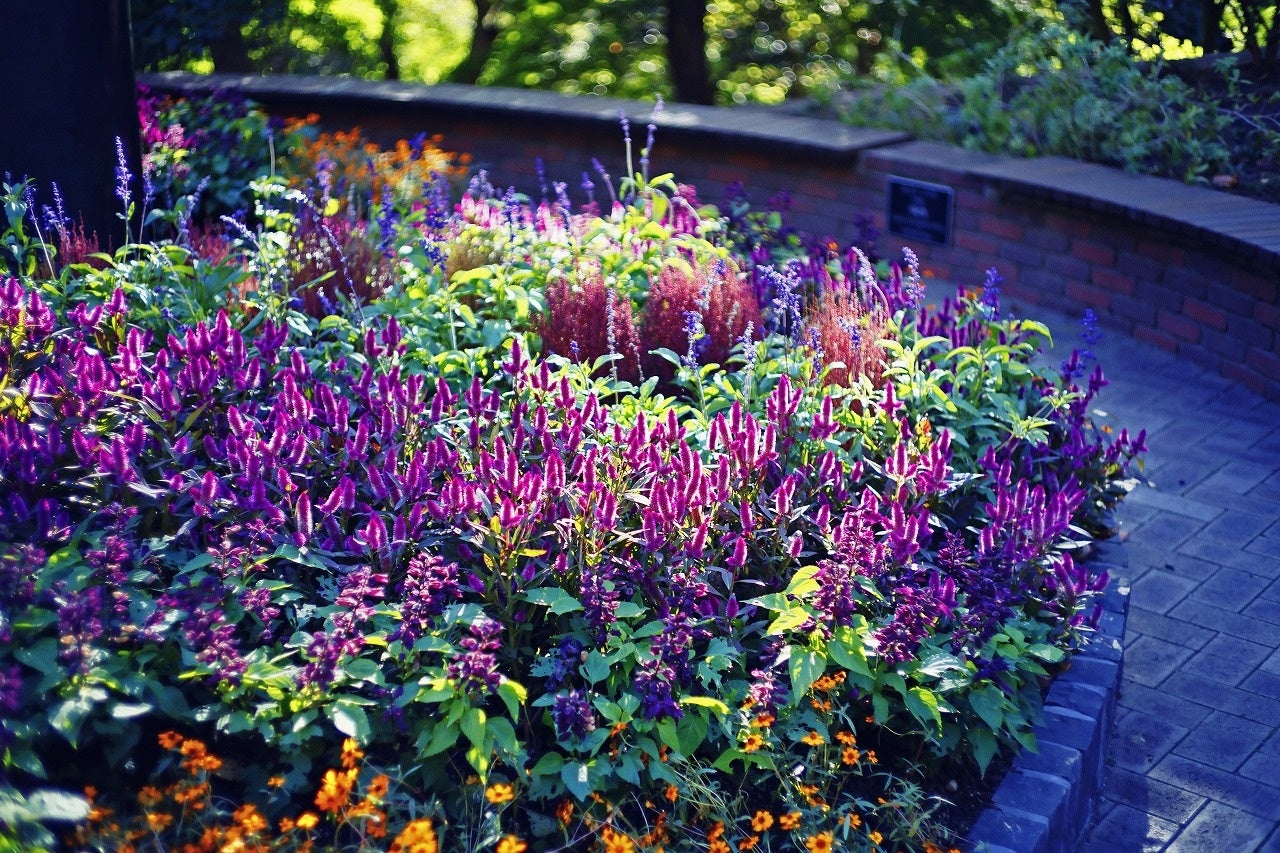 色濃く鮮やかな秋のハーブや花々の中、コキアの草姿が秋ならではのガーデン風景を演出しています。