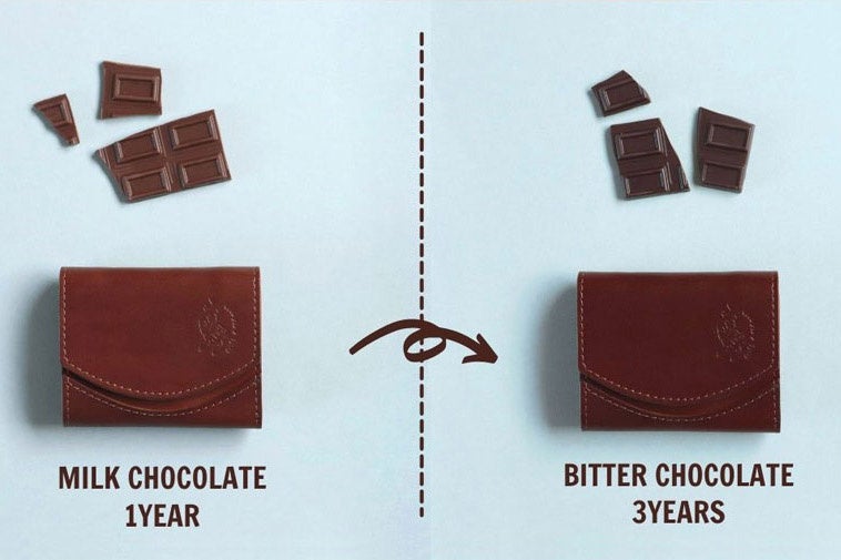 初めはミルクチョコレートのような色合いが、馴染むとビターチョコレートのように変化していきます。