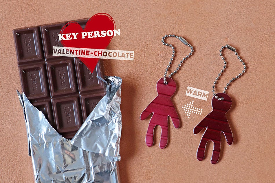 バレンタイン期間限定で「温度で色がかわる」チョコカラーのキーホルダーをプレゼント。