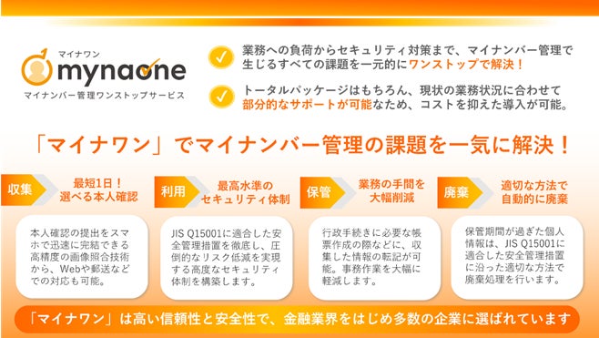 このたび、当社およびODKが提供するマイナンバー管理のワンストップサービス「マイナワン」とTRUSTDOCKが協業することで、より多くの本人確認業務を必要とする事業者に利便性を提供できると考え、本提携にいたりました。マイナンバー管理ワンストップサービス「マイナワン」およびTRUSTDOCKは高い信頼性と安全性が要求される金融業界の水準に合わせてサービス設計されており、また導入企業のニーズによって柔軟にサービス提供範囲を選べるので、事業者様のニーズに合わせてご導入いただけます。