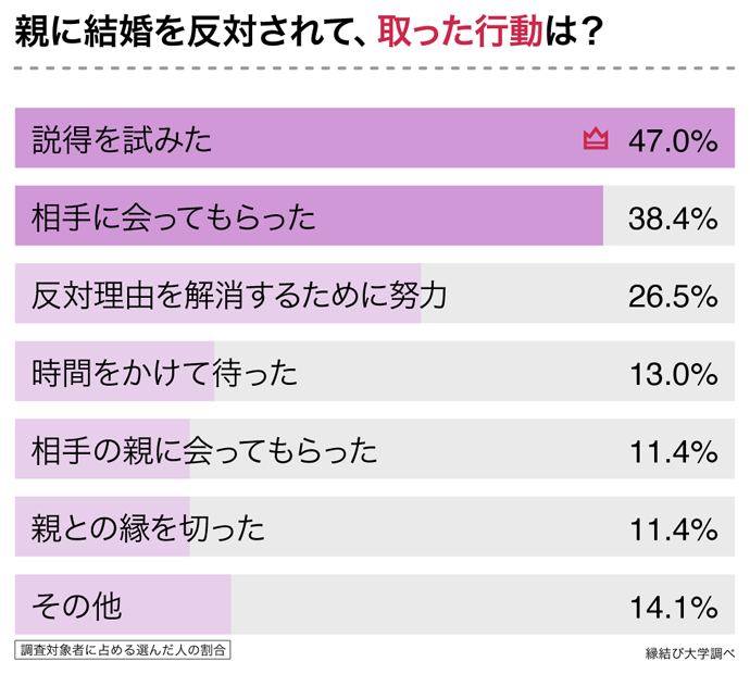 - 親に結婚を反対されて取った行動1位は「親の説得」