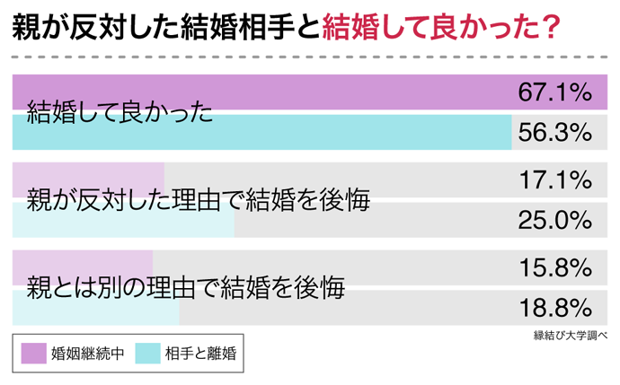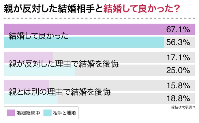 ただ、離婚した人のほうが「良かった」と回答した人は少ないものの、離婚しても半数以上は「親が反対した人との結婚を後悔していない」という事実も判明しました。