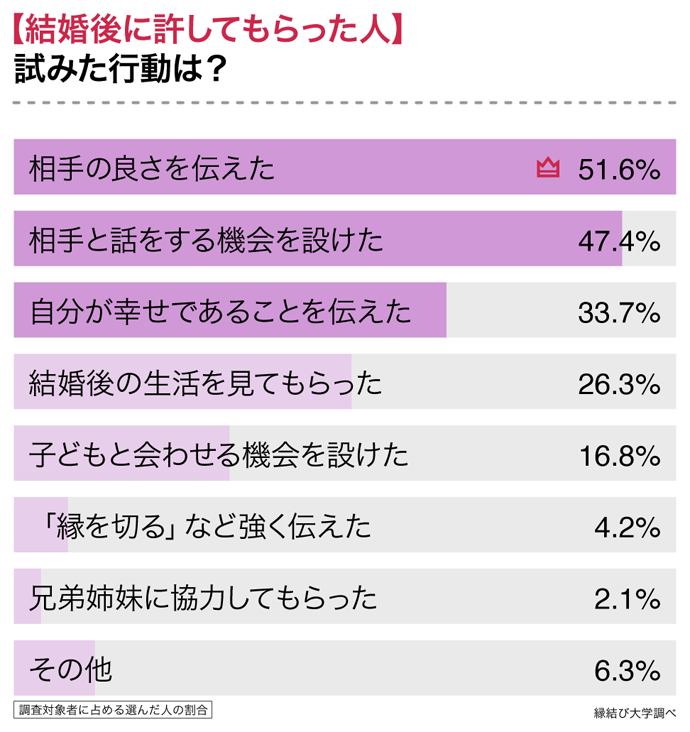 結婚する際には親に反対されたままだった人が、結婚後に許してもらうためにどのような行動を取ったのかについても聞いてみました。その結果、「相手の良さを伝えた」人が51.6%と、もっとも多くなりました。結婚を強行した後も、親に理解してもらえるように努力した人が半数以上となっています。