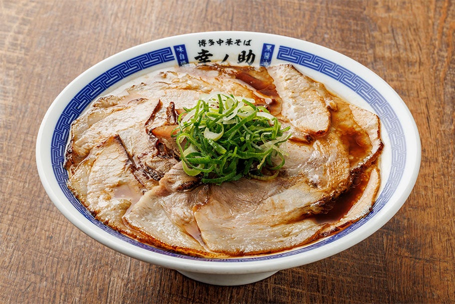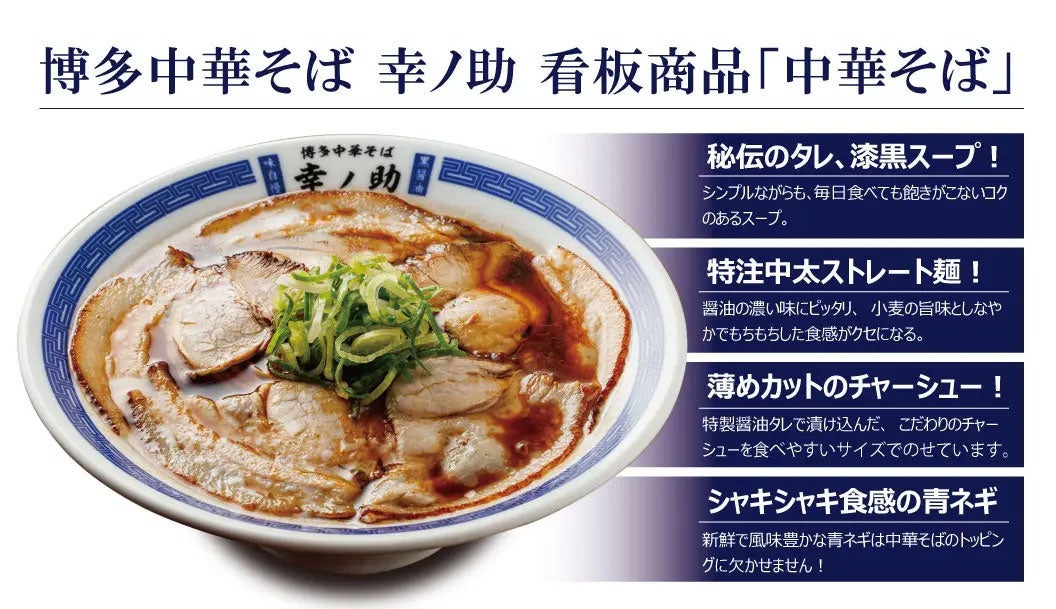博多中華そば幸ノ助はインパクトのある漆黒のスープが自慢の中華そば専門店です。その味は、福岡で創業120余年の醤油蔵元である「ヤマタカ醤油」で作られる「熟成醗酵醤油」を使用。そして、店内でも独自の熟成方法でじっくりと時間をかけて旨味を増し完成させたこだわりの醤油タレを使用しています。鶏ガラと豚でとったあっさりながらも、旨味の濃いスープと合わせると、深みのある芳醇な味わいを感じられますが、後味はスッキリと食べられる絶品のスープです。麺は福岡の製麺所『製麺屋慶史』が作る特注の中太ストレート麺。小麦の旨味と、しなやかでもちもちした食感は濃い醤油スープにピッタリです。トッピングには福岡県産の青ネギとたっぷりのチャーシュー。チャーシューの味付けにはこだわりの醤油タレが使用されており、あえて薄くカットすることで麺やスープとマッチし食べやすくしています。そんな博多中華そば幸ノ助は、お⼦様からご年配の⽅、⽼若男⼥問わず幅広い⽅達より⽀持いただいております。