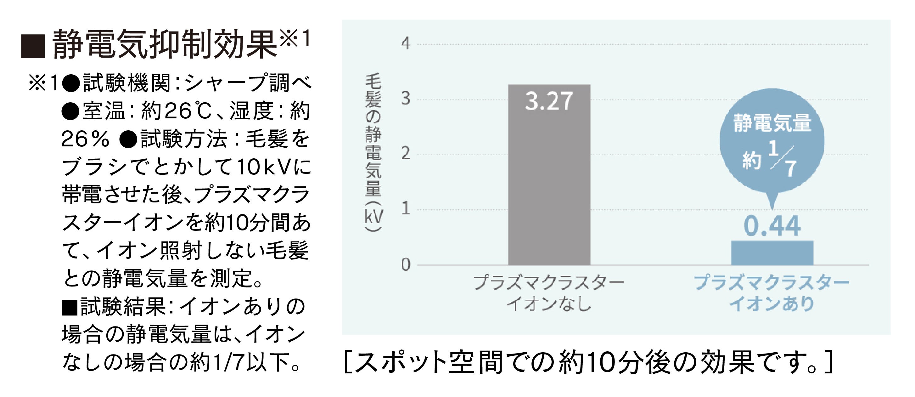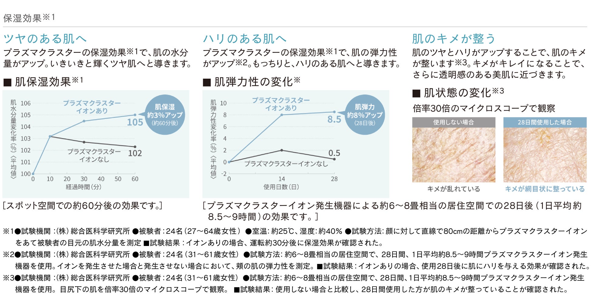 ※ プラズマクラスターの効果は、使用場所の状況(温度・湿度、広さ、形状、エアコン・換気などの使用有無、商品の設置場所など)や商品特性、使いかた(イオンの吹き出し方向・運転モード・運転時間など)によって異なります。