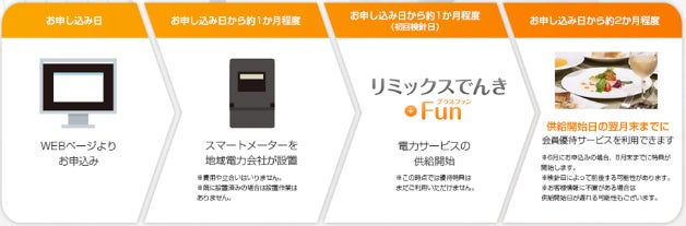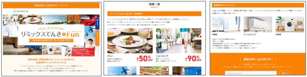 今回サービスを開始する「リミックスでんき + Fun(プラスファン)」は、東京電力などの地域電力会社と同等額の電気代をお支払いいただければ、家電修理サポートや多彩な優待サービスがご利用いただける、新しい形の電力プランです。6月1日(水)より全国(沖縄・離島を除く)での事前申込みを開始いたします。ご契約いただいたお客様は、ご自宅の冷蔵庫やエアコン、洗濯機に自然故障が発生した場合、修理サポートがお受けいただけます。また、優待サービスは、全国60,000店舗以上のレストランや、20,000件以上の全国のリゾート施設などを、最大80%オフでご利用いただけます。ご家族そろって、お一人おひとり、お客様それぞれのライフスタイルにあわせた優待をぜひご利用ください。