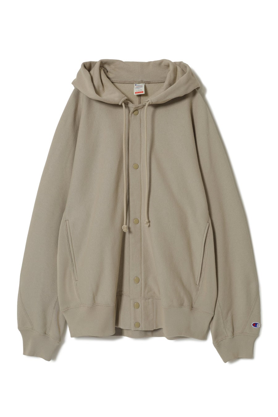 Champion を代表する製法の「REVERSE WEAVE®」を再構築し、着込むほどに独特の風合いや味わいが出る11.5oz(11.5オンス)の裏起毛素材を身体に沿った立体裁断で組み上げ、前身頃からスリーブの上部、後身頃にかけて一枚の生地で製作したスナップフーデッドスウェットシャツです。