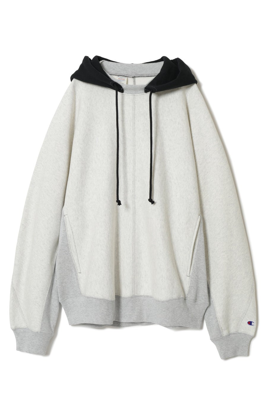 Champion を代表する製法の「REVERSE WEAVE®」を再構築し、着込むほどに独特の風合いや味わいが出る11.5oz(11.5オンス)の裏起毛素材を身体に沿った立体裁断で組み上げ、前身頃からスリーブの上部、後身頃にかけて一枚の生地で製作したフーデッドスウェットシャツです。