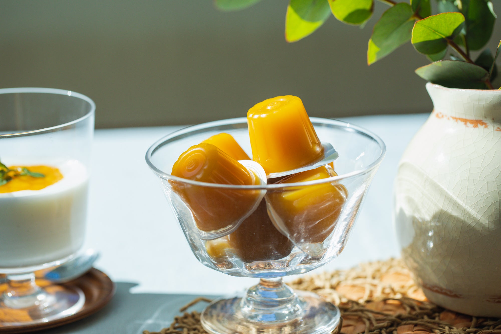 「マンゴーの王様」と呼ばれる、インド産アルフォンソマンゴー100%のピューレを贅沢に使用した、マンゴーの濃厚な甘みと爽やかな酸味が口いっぱいに広がるひとくちサイズのゼリーです。