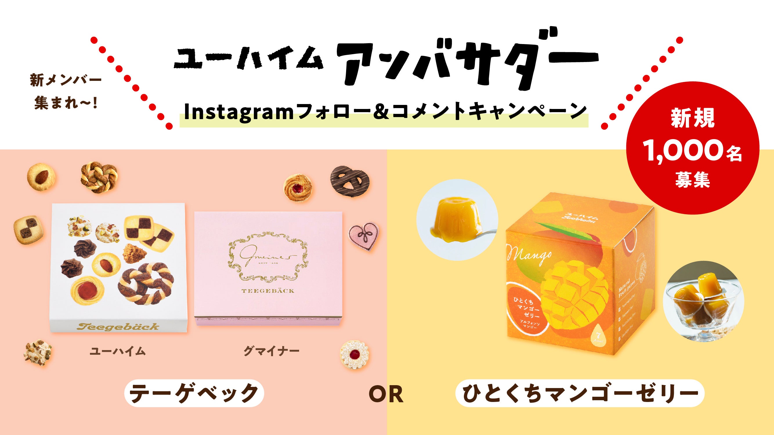 今回は、日本出店100周年を迎えた「ユーハイム」&ドイツの老舗ブランド「Gmeiner(グマイナー)」の定番ビスケットと、ユーハイムの季節限定ゼリーからお選びいただけます。また、一緒にユーハイムのお菓子の魅力を発信していただける、新たなアンバサダーを1,000名募集します。みなさまと素敵なお菓子時間を共有できることを楽しみにしています。