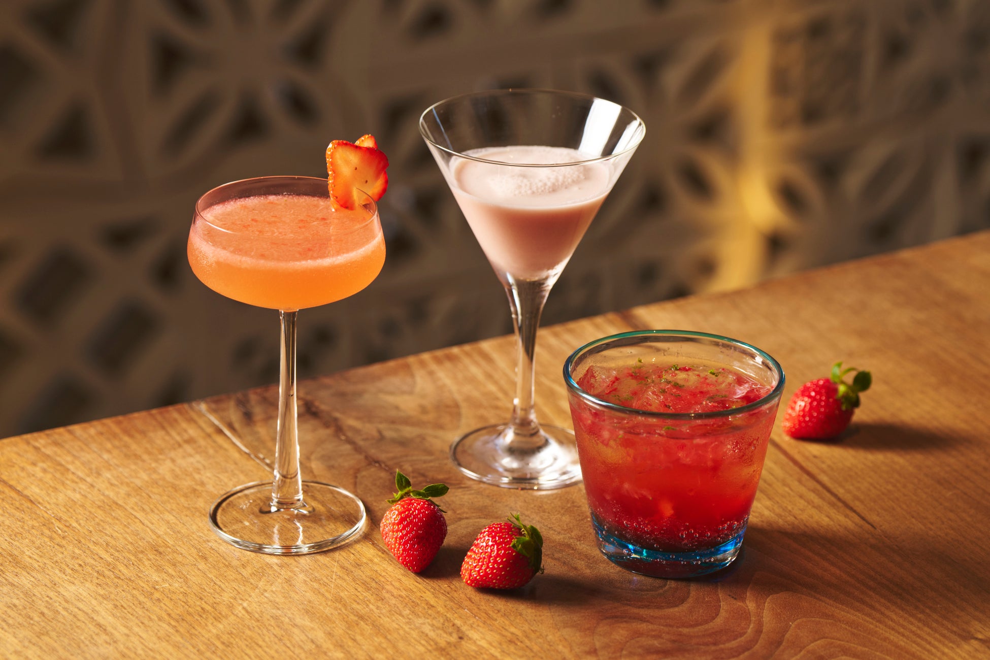また、サンセットが美しいシラカチバーでは、いちごの魅力を大人の切り口で表現したカクテル3種をご用意しました。沖縄ならではのバタフライピーを合わせた「ストロベリーバタフライマティーニ」、アルコールが苦手な方もバー空間をお楽しみいただけるよう、いちごとクリームを使用した「ストロベリールージュ(ノンアルコール)」、カクテルの中で人気のあるネグローニのアレンジ「ストロベリーネグローニ・ズバリアート」など、今だけの味わいをご提供します。