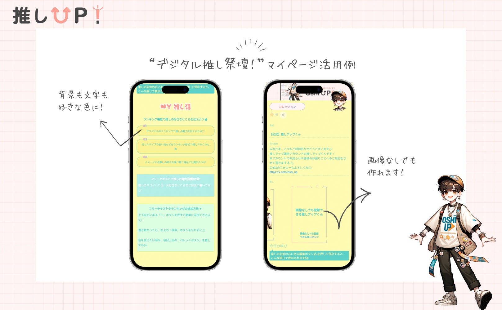 推し活アプリ推しアップのイチオシコンテンツ!背景や文字などを自由に推し色カラー設定したり、推しのポイントやグッズ、推しメイクなど、自分の好きな推しコンテンツを自由自在にカスタマイズできるマイページで推しへの愛を語ろう!