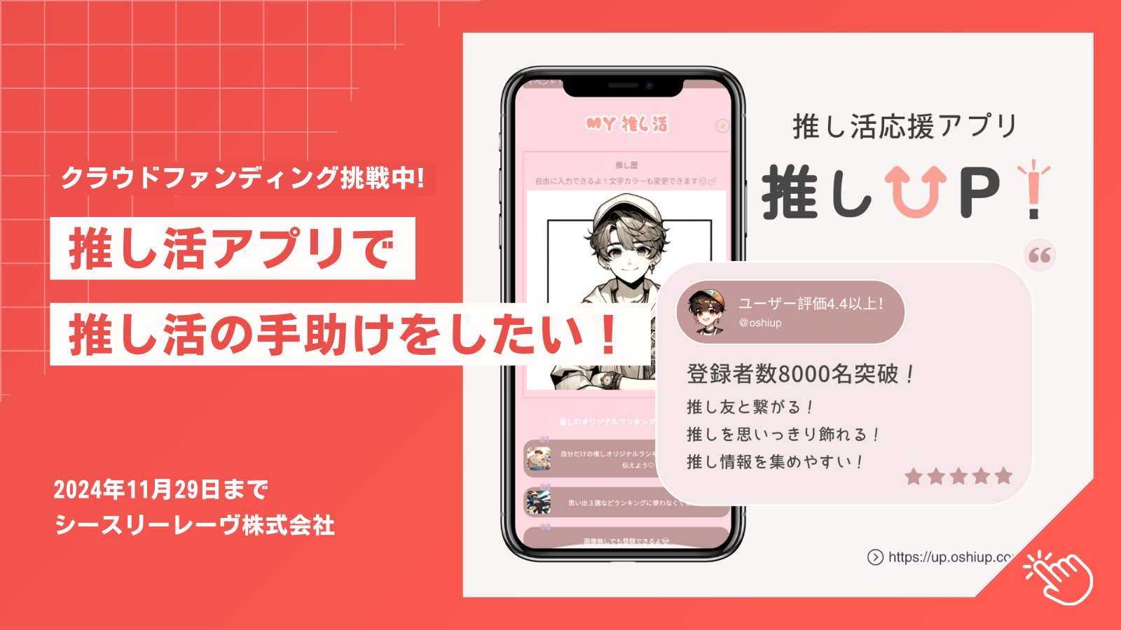 シースリーレーヴ株式会社(本社:東京都港区、代表取締役社長:空野正輝)は、推し活応援アプリ「推しUP!」のクラウドファンディングを開始しましたことをお知らせ致します。