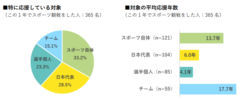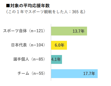 ・「スポーツ自体」「チーム」と比べ、「日本代表」「選手個人」の応援期間は4~6年と短い。