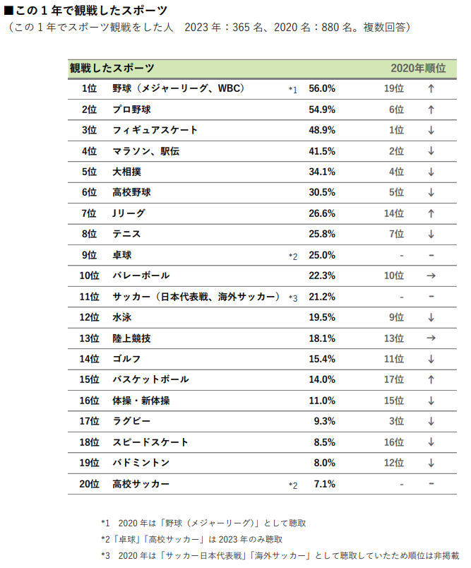 ⇒2020年3月に実施した調査のトップ3は「フィギュアスケート」77.4%、「マラソン、駅伝」69.7%、「ラグビー」62.7%。なお、「野球(メジャーリーグ)」は19位(10.6%)、「プロ野球」は6位(46.9%)だった。