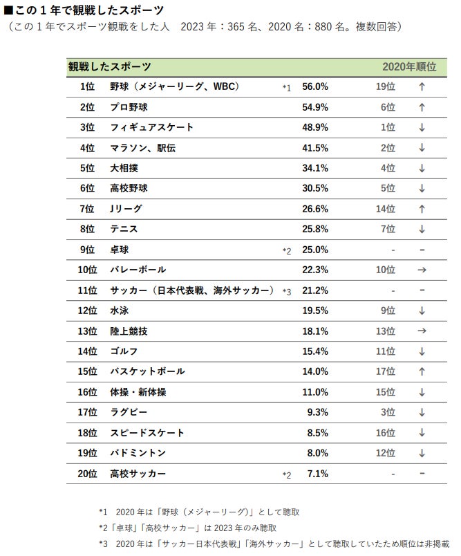 ・観戦したスポーツ1位は「野球(メジャーリーグ、WBC)」、2位には「プロ野球」が入った。それぞれ2020年調査時の19位、6位から大きく上昇した。
