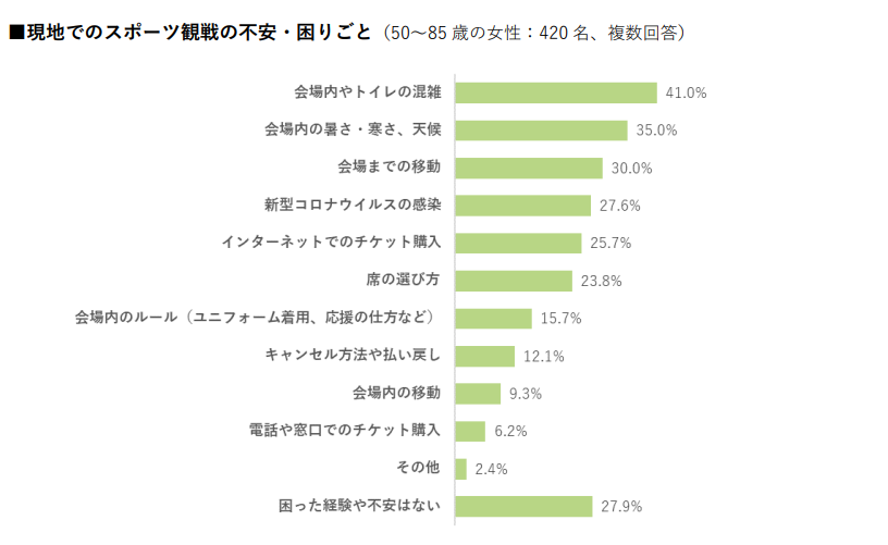 ⇒現地でのスポーツ観戦時の不安・困りごととしては、「会場内やトイレの混雑」「暑さ・寒さ・天候」「会場までの移動」が上位に挙げられた。「困った経験や不安はない」は3割弱。