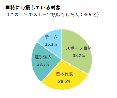 ・特に応援している対象は、「スポーツ自体」33.2%、「日本代表」28.5%、「選手個人」23.3%に分散した。