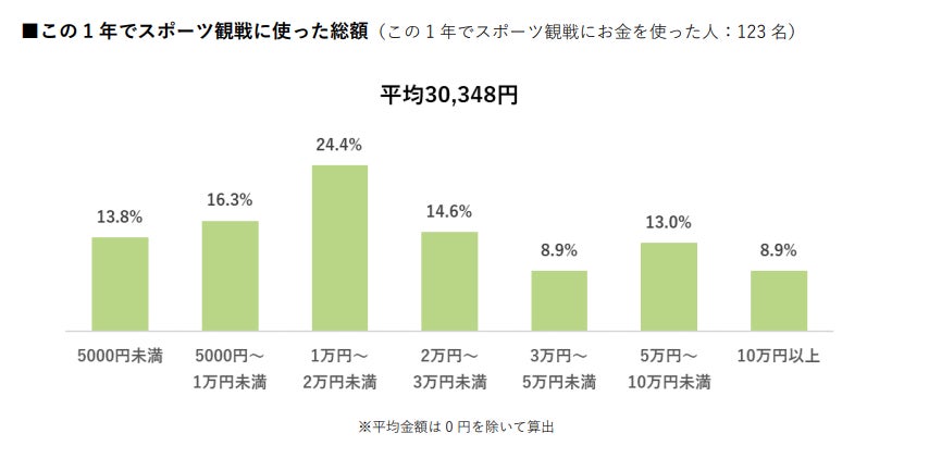 ・チケット代や交通費、BSの契約などを含むスポーツ観戦にかけた総額は、年間で平均30,348円。10万円以上は8.9%。