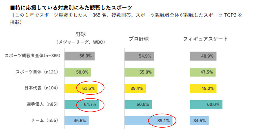 ⇒「スポーツ自体」と比べて応援期間が短い「日本代表」「選手個人」応援タイプは、特に「野球(メジャーリーグ、WBC)」の観戦が多く、WBCや近年メジャーで活躍する日本人選手の影響が大きい。