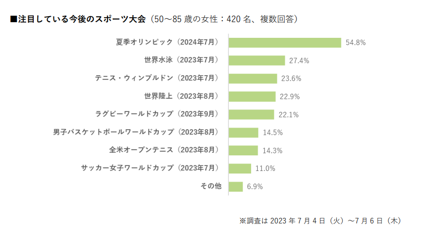 さて、2023年、2024年は国際スポーツ大会が目白押し。WBCだけではありません。7月からは世界水泳、FIFAサッカー女子ワールドカップが行われました。8月には世界陸上、テニス全米オープン、9月には前回調査で上位にランクインしたラグビーワールドカップ、来年には夏季オリンピックも控えています。現時点では、パリで開催される「夏季オリンピック」への注目度が最も高く54.8%。「世界水泳」「テニス」「世界陸上」「ラグビー」と続きますが、20~30%とイマイチ弱い。しかし、スポーツが国単位で活躍したり、キラキラとしたスター選手が登場したりすれば、メディアがにぎわい、シニア女性は胸熱になると予測します。何といってもシニア女性にとってのスポーツには、「元気がもらえる」「熱中できる」「ハラハラドキドキする」という効用があり、元気度がググッと高まるわけですから。