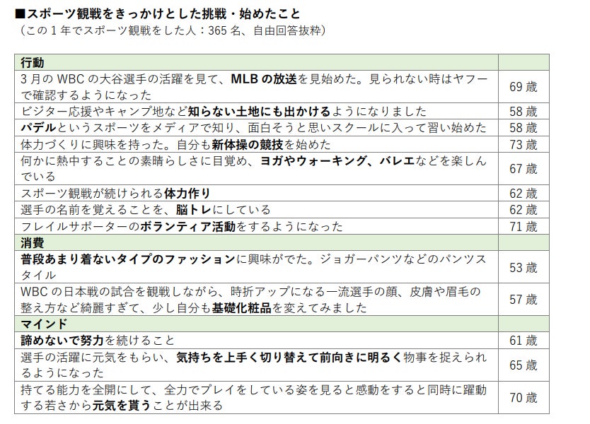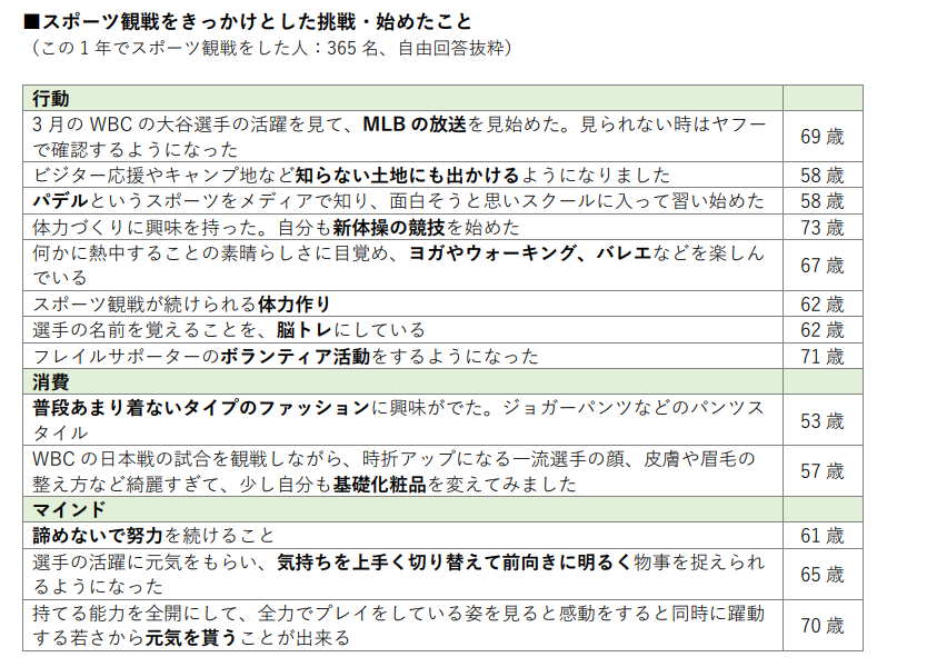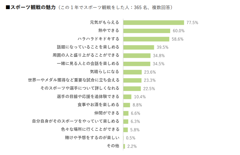 ⇒観戦の魅力は「元気がもらえる」「熱中できる」。観戦をきっかけに「運動を始めた」人が多く、「脳トレとして選手名を覚える」「スポーツ系ファッションに興味を持った」といった声も。
