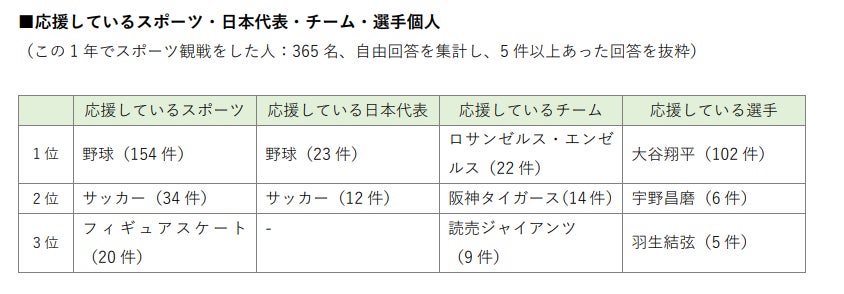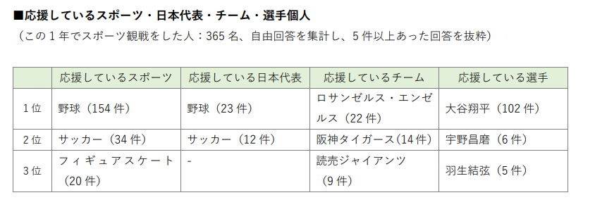 ⇒応援しているスポーツは「野球」が154件、選手名は「大谷翔平」が102件と、2位以降に大きな差をつけた。なお、2020年の調査では選手名の1位は「羽生結弦」180件であった。(各調査回答者数が異なるため、件数は参考値)