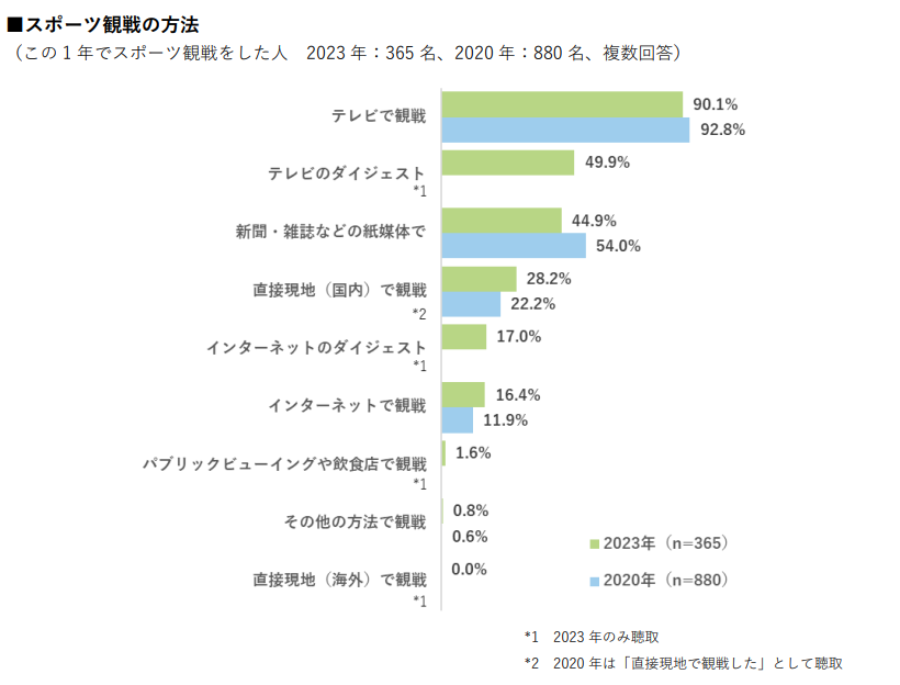 ⇒観戦方法の内訳は「テレビでの観戦」90.1%、「テレビのダイジェスト」49.9%、「新聞・雑誌などの紙媒体」が44.9%。「現地での観戦」は28.2%。なお、2020年3月に実施した調査では「現地での観戦」は22.2%であった。
