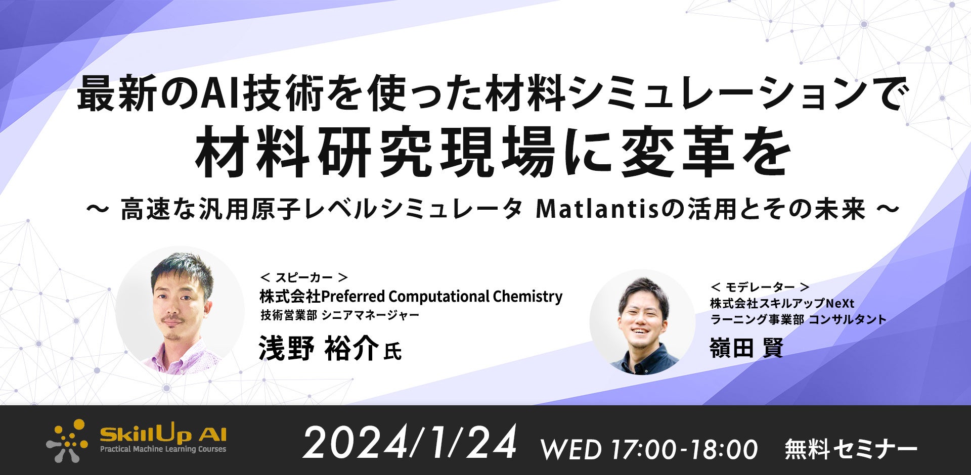 内容:深層学習などのAI技術を活用した高速な汎用原子レベルシミュレーション「Matlantis™」が新素材探索にどのように貢献するのかについて解説。