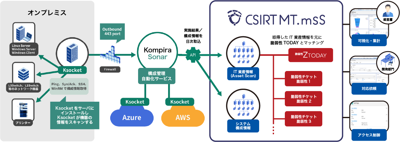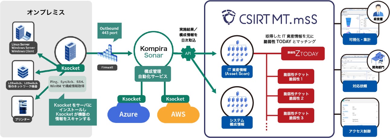 今回追加された機能により、株式会社フィックスポイント(本社:東京都渋谷区、代表取締役:三角 正樹)が提供する運用自動化プラットフォーム「Kompira Sonar」がスキャンした最新のIT資産情報やシステム構成情報を、「CSIRT MT.mss」へ自動で取り込むことができます。