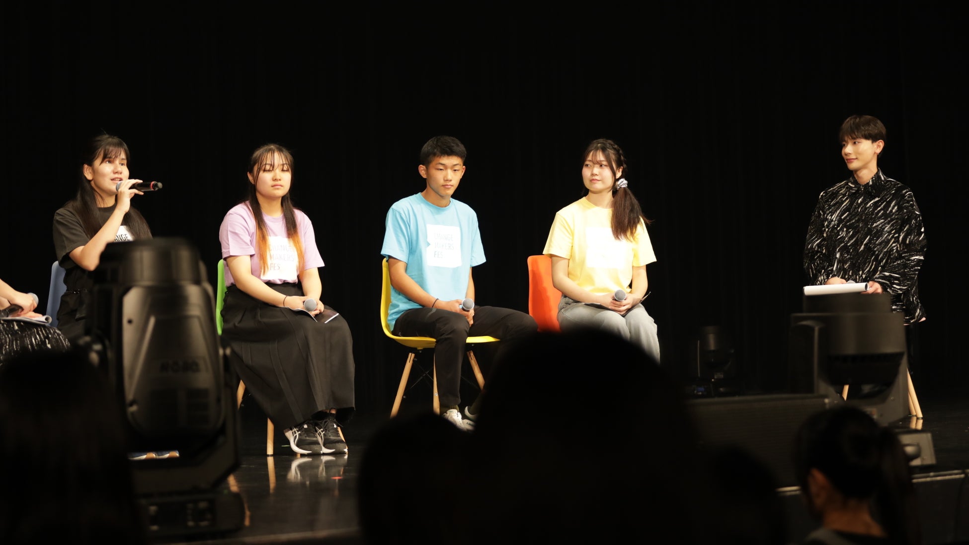 「よしミチの部屋」のコーナーでは、ミチさん・よしあきさんのお二人と、チェンジメーカーたちがトーク。まず、チェンジメーカーのみなさんに、アクションを起こす上で壁にぶつかった経験について聞くと、「アクションを始めた頃、文化祭でフェアトレード商品を販売した際、売ることだけが目的になってしまった」と話した大学生の下平心那さん。しかし、その壁を乗り越える方法として、フェアトレードに関するワークショップとカフェという対面イベントを仲間と一緒に考え、実現することができたと言います。よしあきさんは「わからないことがあったら、立ち止まってしまうのではなく、アクションを続けることが大切ですね」とコメント。昨年のチェンジメーカー・フェスをきっかけにアクションを始めた高校生の鈴木まゆさんは、「私たちも、ステージを見ているみなさんと何も変わらない。一緒に巻き込んでいけたら」と会場の参加者へエールを送り、最後にミチさんは「みんなのお話を聞いて、勇気をもらえたので、一緒にアクションを起こしていきたいです!」と締めくくりました。
