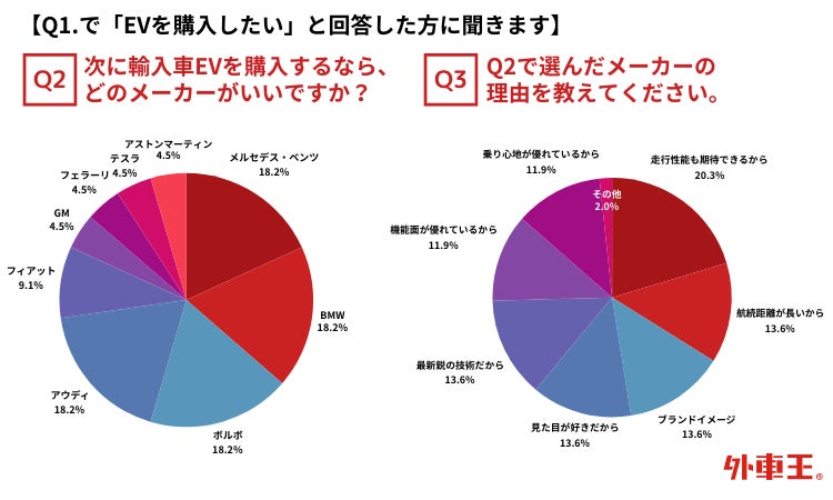 ・調査内容:Q1.次に輸入車を購入するならEVが欲しいですか? 【Q1.で「EVを購入したくない」と回答した方に聞きます】Q2.次に購入したいEV以外の自動車は何ですか?・Q3.Q2で回答した理由を教えてください。 【Q1.で「EVを購入したい」と回答した方に聞きます】Q2.次に輸入車EVを購入するなら、どのメーカーがいいですか? Q3.Q2で選んだメーカーの理由を教えてください。