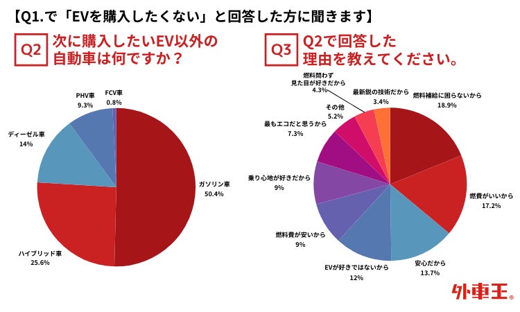 Q1で「EVを購入したくない」と回答した方に次に購入したいEV以外の自動車について尋ねてみると、1位は多くの票が入り、「ガソリン車」50.4%が選ばれました。ガソリン車を選んだ理由については、「安心だから」「 燃料補給に困らないから」や、「乗り心地が好きだから」の回答が多く挙がりました。