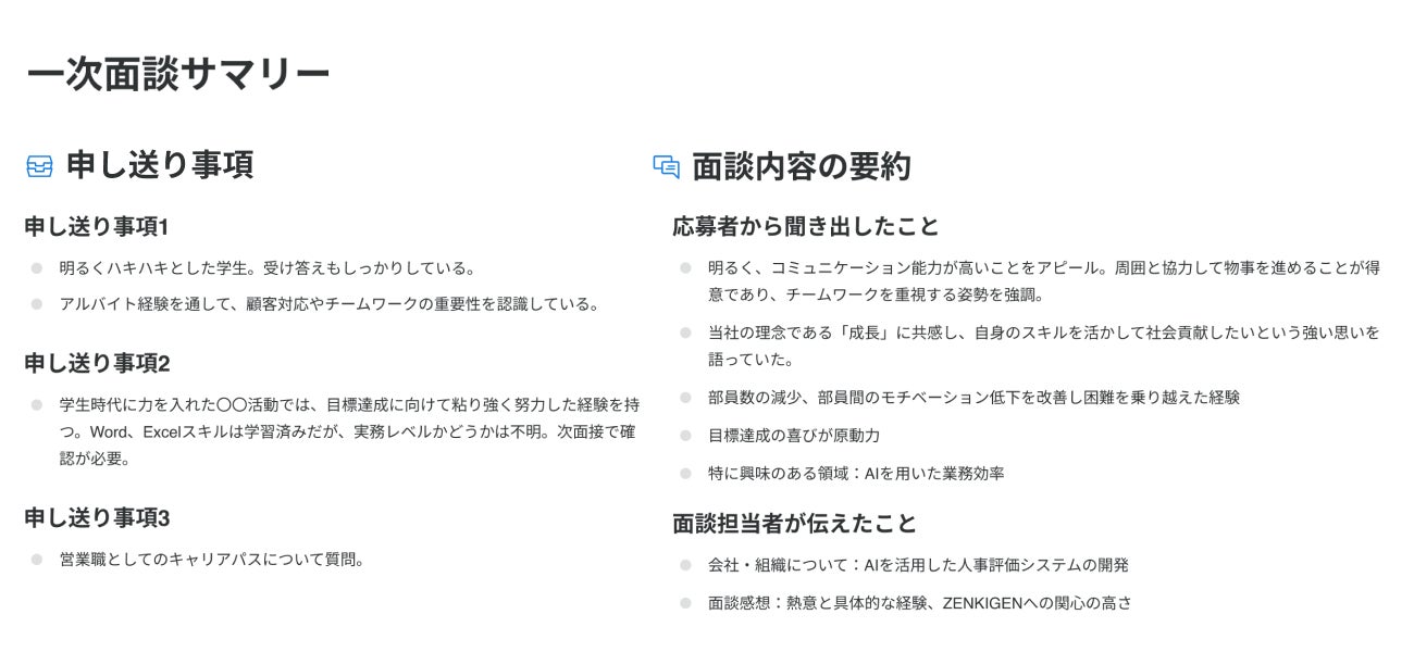 「harutaka」で実施したWeb面接の動画データをAIが分析し、文字起こし・要約・次の面接担当者への申し送り事項を即時に生成します。これにより、面接担当者の負担を軽減し、応募者との対話に集中できる環境をサポートします。また、データが蓄積されることにより、評価基準の平準化を実現します。